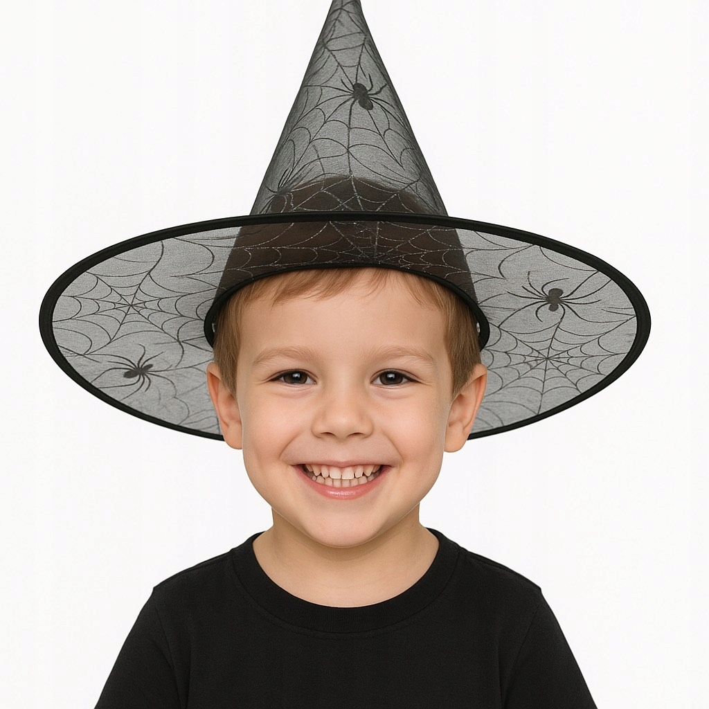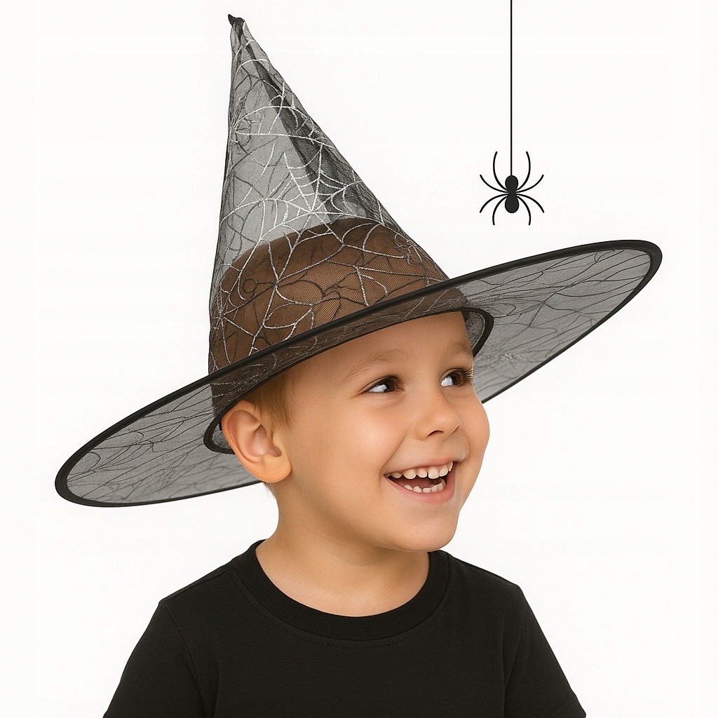 Jeśli kompletujesz kreacje czarownicy lub czarodziejki to ten kapelusz jest świetnym dodatkiem. Kapelusz wykonany z przyjemnego w dotyku materiału. Kapelusz posiada srebrny nadruk z siecią i pajakami,